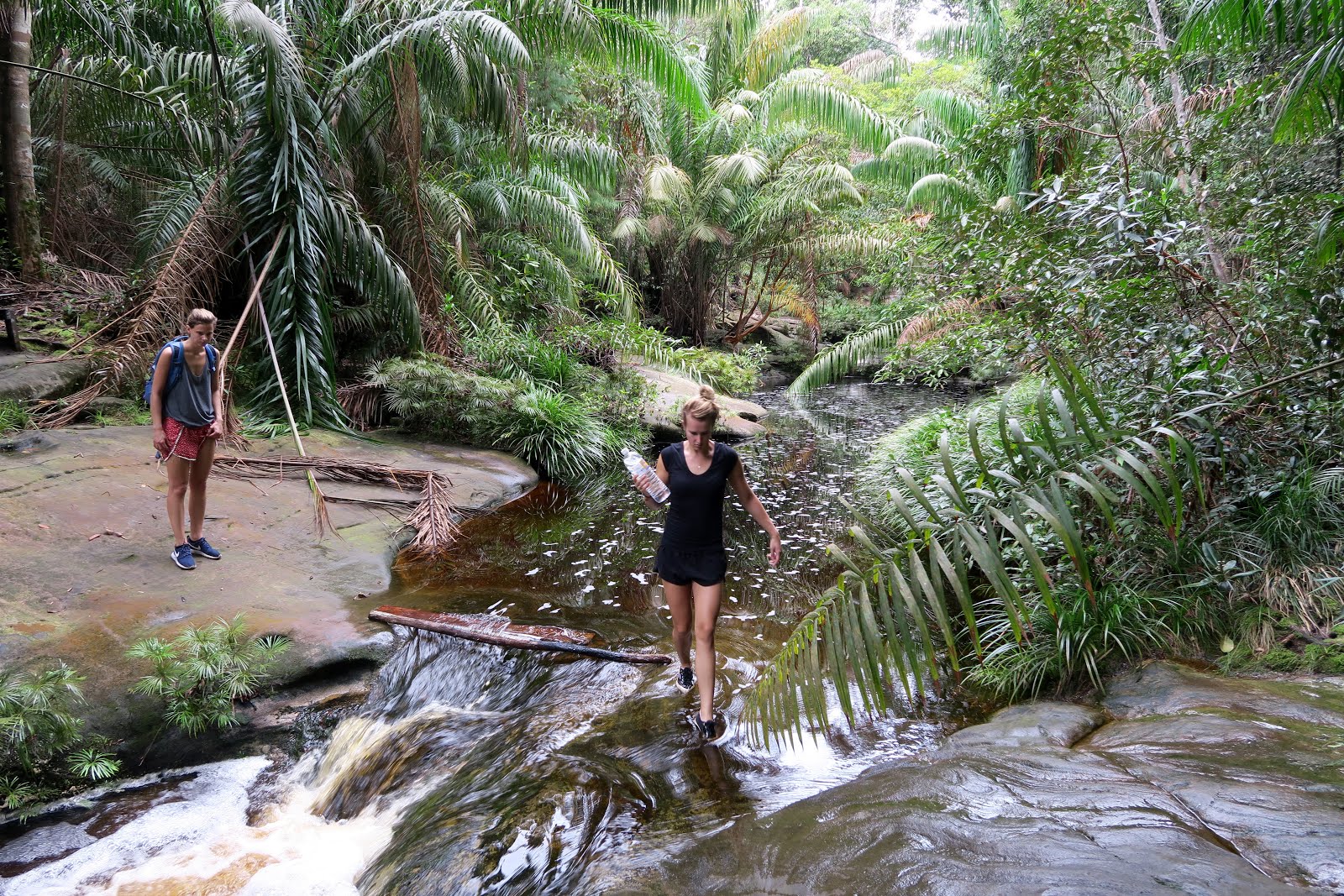 Da vi kom frem til Bako Nationalpark, tjekkede vi ind og lagde vores ting i et opbevaringsrum. Vi kunne vælge mellem flere ruter, men vi ville gerne se en speciel sten, som alle rejsebøgerne viste billeder af, når de fortalte om Bako Nationalpark. Ruten dertil var 4 km, men ville tage 2,5 time fordi det var en teknisk svær rute. Jeg fik pigerne overtalt på den betingelse, at vi tog en båd tilbage derfra.